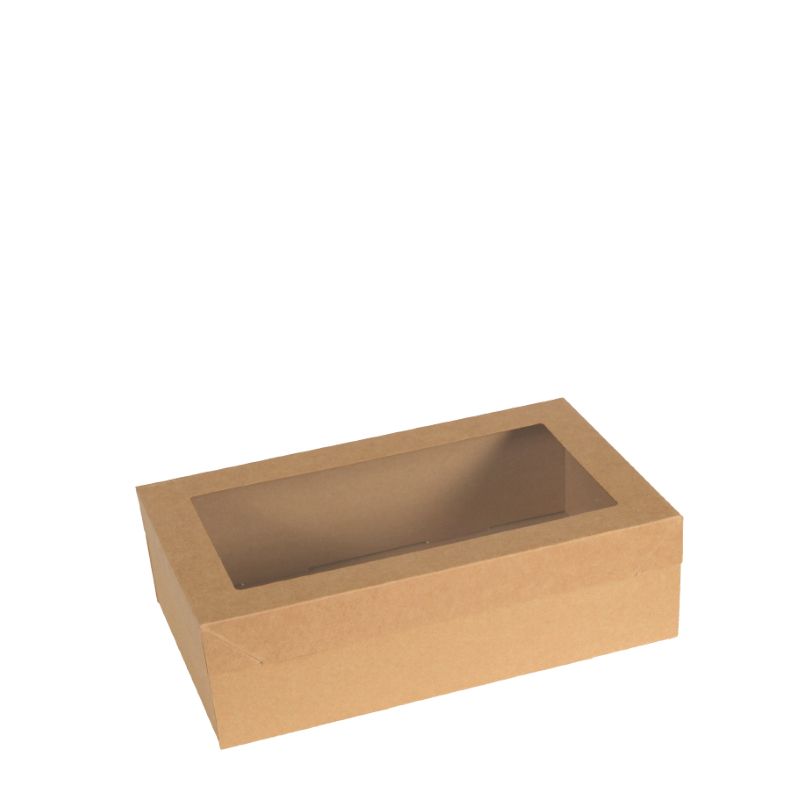 Made from brown kraft paper with a clear plastic window, these catering boxes are not only environmentally friendly but also stylish and sleek looking. Able to transport most types of food such as bread, pastries, fruit or cheese.