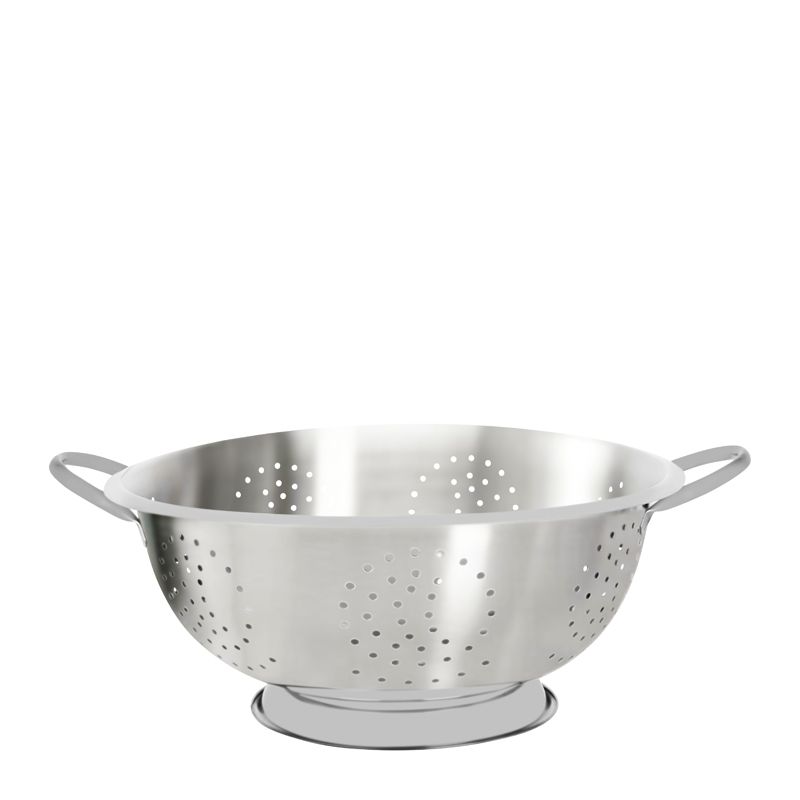 Chef Inox stainless steel colanders are built for heavy-duty use. Made from sturdy 18/10 stainless steel, these colanders have a wide, deep bowl to combat splashes and spills. The stable base easily fits inside other containers while hollow tube handles remain cool even when holding hot food.